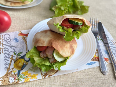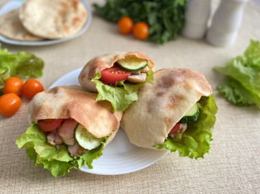 Греческие питы охладите, нафаршируйте любой начинкой и подайте к столу. Я использовала такую начинку: 250 г нарезанного соломкой копченого свиного окорока смешала с соломкой из свежего огурца и 1 ст. л. майонеза. В питу выложила листья салата, ветчину с огурцом и ломтики помидоров.