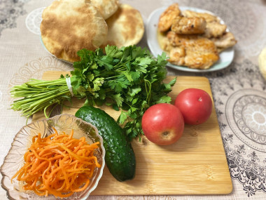 Для наполнения в качестве соуса смешала майонез с кетчупом, вложила салат, кусочки обжаренного куриного филе, овощи, зелень и немного корейской моркови.