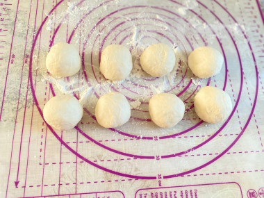 Подошедшее тесто обомните и разделите на 6-8 равных частей. Каждая будет весить примерно 70-75 граммов.