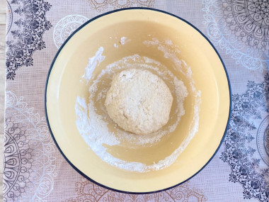 Скатайте тесто в шар, выложите в миску и затяните пищевой пленкой. Оставьте на 30-40 минут в тепле. За это время в муке разовьется клейковина, и тесто станет податливее и эластичнее.