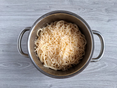 Уменьшите огонь до минимального и добавьте тертый сыр. Хорошо перемешайте до растворения сыра. При необходимости, добавьте еще воды из-под пасты.