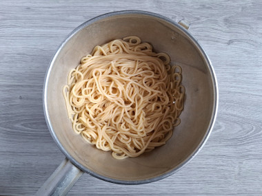 Первым делом поставьте на огонь кастрюлю для макарон. Доведите воду в кастрюле до кипения, посолите, опустите в нее макароны. Варите согласно инструкции на упаковке. Примерно за 2 минуты до готовности пасты слейте воду, оставив стакан воды. О том, как выбрать кастрюлю и макароны для варки читайте в отдельных статьях, ссылки под рецептом.