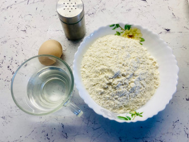 В муке сделайте углубление и влейте в него воду с яйцом. Начните замешивать тесто, сначала ложкой, затем продолжите замес руками. Если тесто после добавления всей воды осталось сухое, то смочите руки водой и продолжите замес. Дополнительно воду лучше не наливать. Если тесто получилось слишком липким, то всыпьте немного муки. Месить тесто нужно долго, 10-15 минут. С хорошо вымешенным тестом будет удобнее работать в дальнейшем.