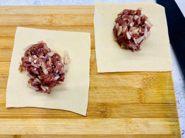 В миске соедините нарезанное мясо, измельчённый лук, добавьте соль и черный молотый перец. По желанию можно добавить и другие специи (зиру, острый перец). Тщательно перемешайте полученную начинку.