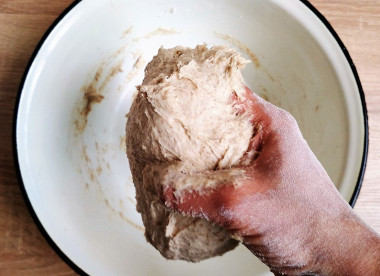 Переложите тесто из миски на стол или деревянную доску, присыпанную мукой, и вымешивайте его до тех пор, пока оно не перестанет быть липким и станет легко скатываться в шар. При необходимости подсыпьте муку.