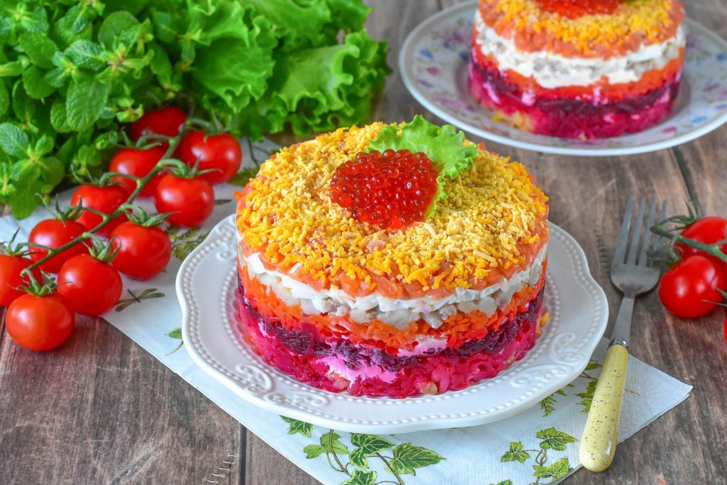 Классическая «Селедка под шубой» была изобретена в СССР и символизировала единство слоев общества. Добавление красной рыбы и икры — это современная «люксовая» адаптация рецепта, которая превращает демократичное блюдо в центральное украшение праздничного фуршета.