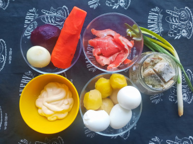 Как сделать салат сельдь под шубой с красной рыбой? Для начала подготовьте необходимые ингредиенты. Майонез можно сделать самостоятельно. Рецепты домашнего майонеза вы найдёте после последнего шага.