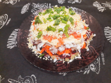 Салат прост в приготовлении, нужно лишь все измельчить. Картошку, свеклу, морковку, желтки и белки натёрла на крупной тёрке. Селедку и форель порезала кубиками, лук полукольцами. Последовательность слоёв соблюдала как указано в рецепте, разве что майонезом смазывала не каждый слой, а через слой. В конце украсила зелёным луком и отправила в холодильник на час.