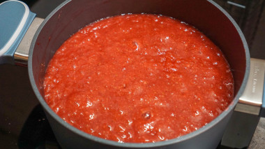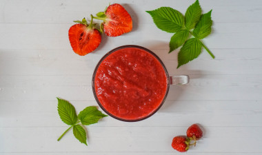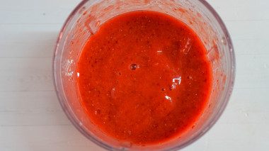 Растворите картофельный крахмал в 1/2 стакана холодной воды и размешайте с сиропом. Опять поставьте на плиту и доведите до кипения, постоянно помешивая. Добавьте предварительно пюрированную клубнику и хорошо перемешайте.