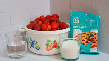 Собрала с грядки спелую клубничку, подготовила необходимые ингредиенты: сахар, крахмал и питьевую воду. Клубнику промыла, очистила от плодоножек и обсушила. Далее измельчила ягоды в пюре при помощи блендера.