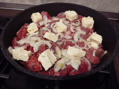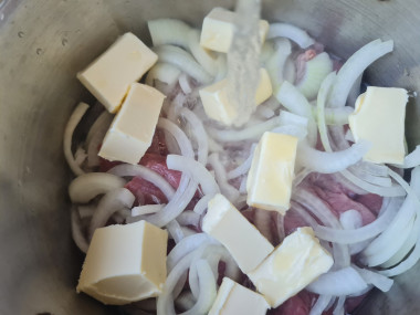 Мясо порезала средними кусочками, лук полукольцами, масло сливочное крупными кусочками.