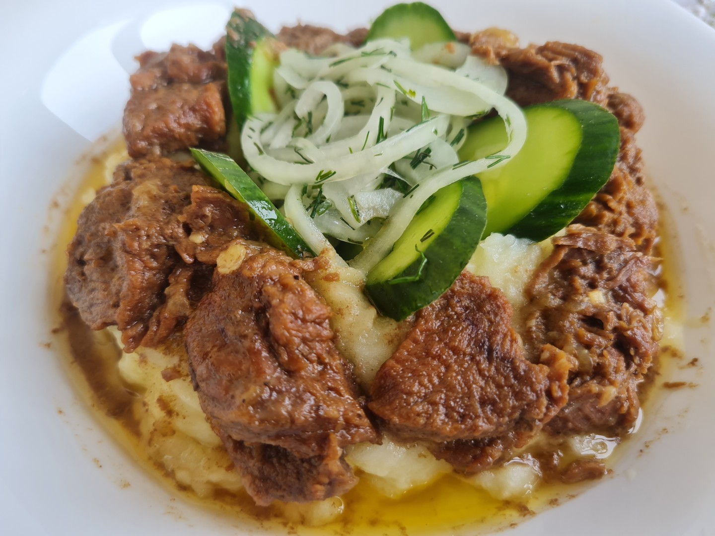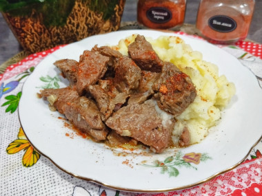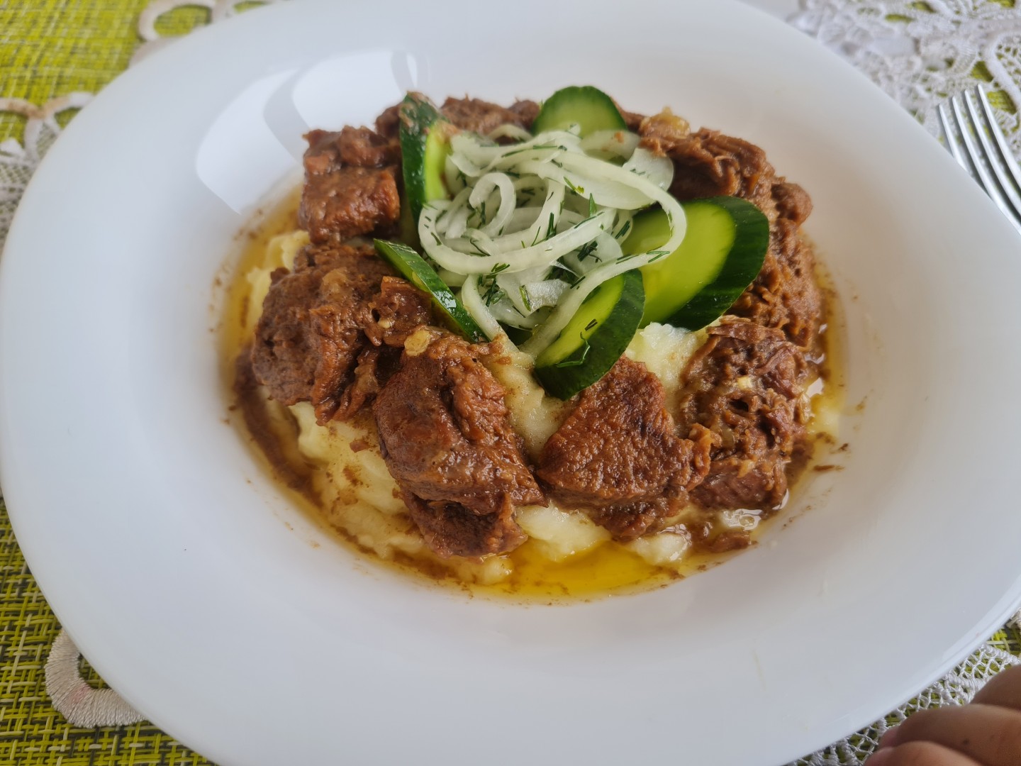 Тушила около часа, затем добавила чеснок, специи, уксус, ещё немного горячей воды и ещё протушила в течение часа. На гарнир приготовила картофельное пюре.