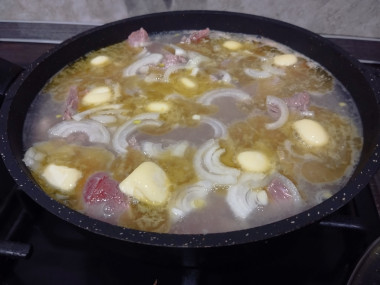 Возьмите кастрюлю или сотейник с толстым дном. Также подойдут казан или сковорода, которые долго держат тепло. Выложите в нее мясо, сверху положите нарезанный лук. А поверх всего нарежьте крупными кусками сливочное масло. О том, как выбрать сковороду или кастрюлю читайте в отдельных статьях, ссылки под шагами.
