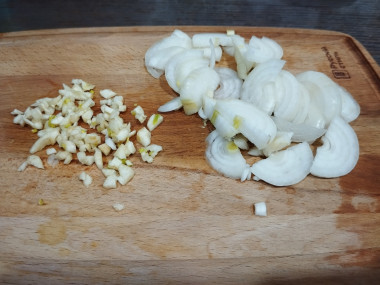 Лук очистите и нарежьте кольцами или полукольцами. Чеснок мелко порубите.