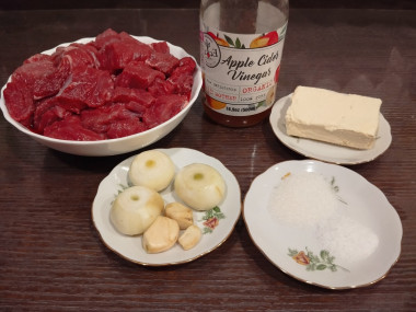 Как сделать мясо по-кремлевски из говядины классическое? Подготовьте продукты. Мясо вы можете взять от любой части туши — при таком способе тушения оно все равно станет мягким. Лук и чеснок кладите по вкусу, можете увеличить или уменьшить их количество. Масло берите качественное, натуральное, без растительных добавок. Уксус понадобится 6%, можно взять яблочный.
