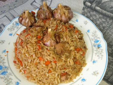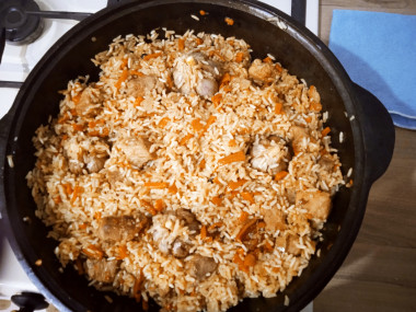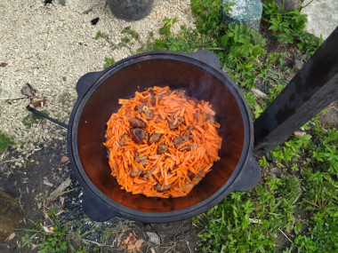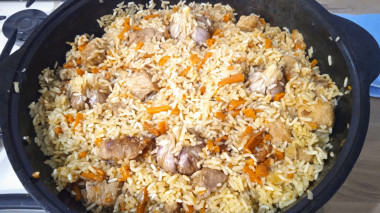 Очень вкусное блюдо! Мы его на второй день свадьбы вместо ухи готовили! Только мы делали маленько не так. Сначала обжаривали лук, потом готовый лук из казана вытаскивали, в этом же масле обжаривали морковь, вытаскивали, потом обжаривали мясо, а перед тем когда засыпать рис все обратно в казан. Так ничего не подгорает и вкус становится насыщенным.
