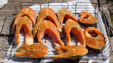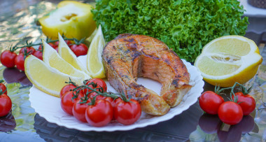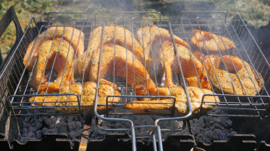 Наконец-то наступили теплые майские денёчки! На выходных мы решили собраться семьей и приготовить форель на мангале на решетке. Рыбу решили разделить на стейки и замариновать. Для маринада использовала немного растительного масла, соль, чеснок и специи для рыбы. Стейки форели оставила на коже, выложила на блюдо и тщательно обмазала маринадом каждый кусочек. Форель мариновалась около 4-х часов. Далее рыбу выложили на решетку и готовили на мангале около 15-20 минут, попеременно переворачивая. Форель на мангале получилась просто космическая, очень сочная и аппетитнейшая! А готовится проще простого! Спасибо автору за рецепт! Стейки форели получились просто отвал башки!