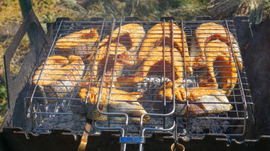 Раскалите угли, если у вас угольный гриль. Можно использовать готовые угли или же разжечь дрова и дождаться, когда они прогорят до раскаленных углей. Выложите рыбу на решетку и обжаривайте, достаточно часто переворачивая, чтобы рыба не пригорела. Имейте в виду, что форель - рыба жирная, и капающий во время запекания рыбий жир, может вызвать возгорание углей. Общее время жарки около 20 минут, но может уйти больше или меньше в зависимости от толщины кусков.