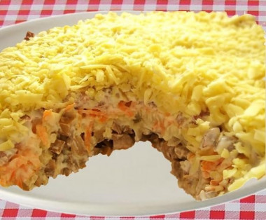 5. Выложите салат слоями, каждый промажьте майонезом: сардина, лук, белок, морковь, сыр, желтки.