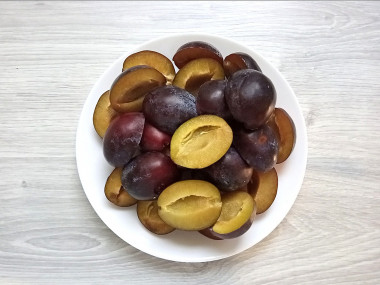 Сливы помойте, при необходимости удалите листики и веточки. Разрежьте сливы на половинки и удалите косточки.