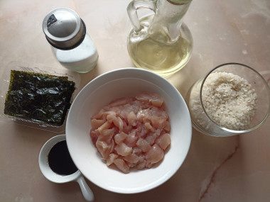 Как сделать онигири с курицей терияки в домашних условиях? Подготовьте продукты. Рис подойдет как специальный для суши, так и обычный круглый, краснодарский. Подробнее о сортах риса читайте в отдельной статье по ссылке в конце рецепта. Филе возьмите от грудки, оно готовится быстрее.