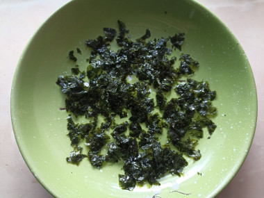 Лист нори нарежьте на тонкие полоски при помощи ножниц. Обваляйте в них шарики онигири.