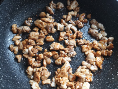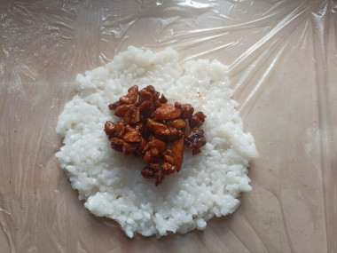 Курицу нарежьте на небольшие кусочки. Обжарьте ее в растительном масле до изменения цвета, после чего влейте соус. Жарьте курицу до готовности, 10-15 минут, после чего также остудите. Возьмите небольшой пакет, расстелите его на столе. Выложите на пакет ложку риса, размажьте его. В центр положите ложку курицы в соусе.
