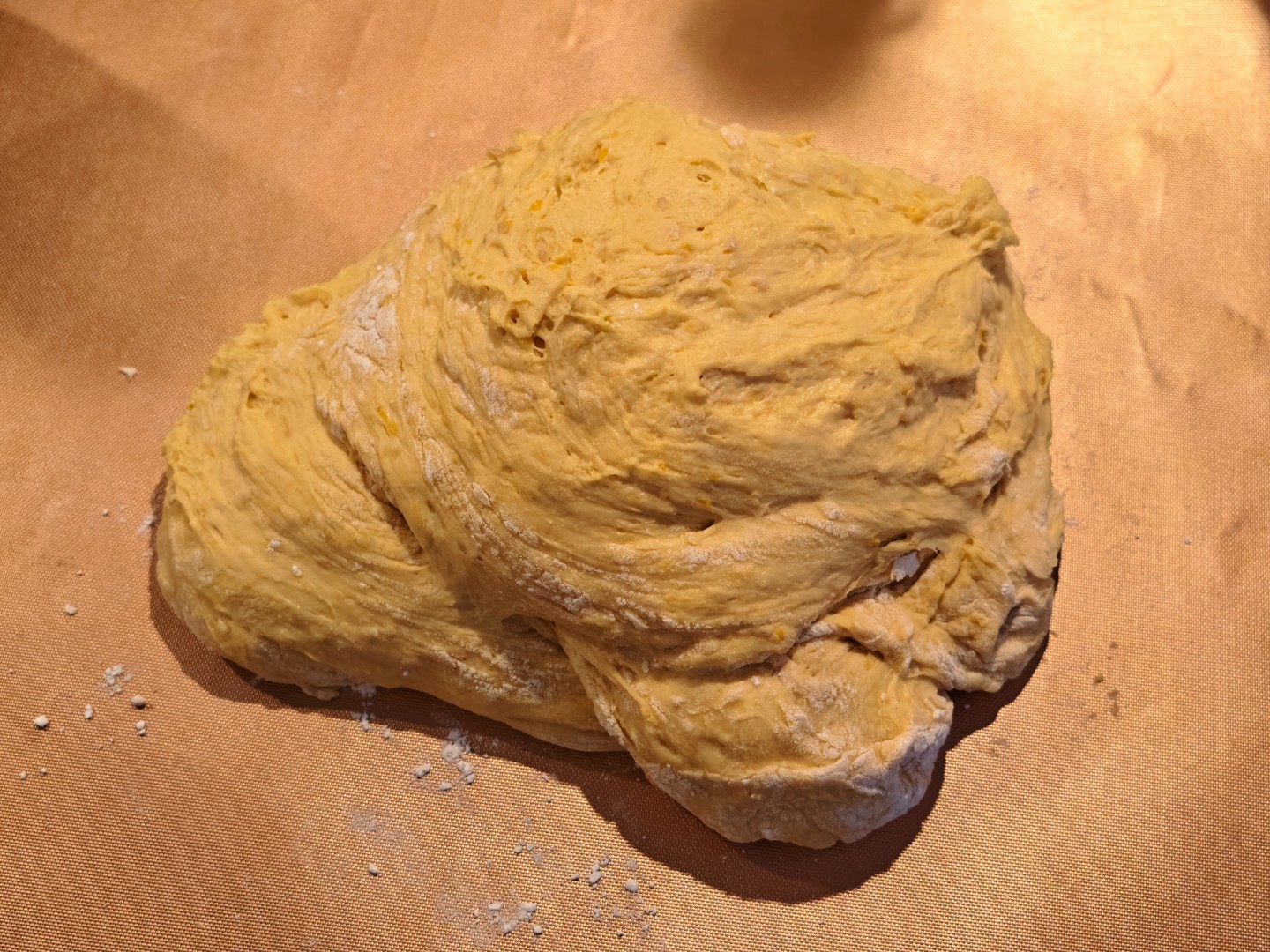 В 90 мл. тыквенного отвара растворить дрожжи и сахар и оставить на 15 мин. Соединить с тыквенным пюре + масло (отвар) + соль + муку, замесить тесто и оставить на 40 мин.