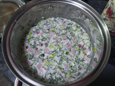 Вливаем холодную воду, которую нужно заранее закипятить и остудить. Можно использовать фильтрованную. Я налила 700 миллилитров воды - окрошка получилась средняя по густоте. Все перемешиваем. Окрошка готова. Если вы не сразу будете ее кушать, то перелейте в эмалированную или стеклянную тару и храните в холодильнике.