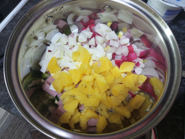 Все подготовленные ингредиенты (огурец, зелень, яйца, картошку, колбасу, редис) перекладываем в глубокую миску.