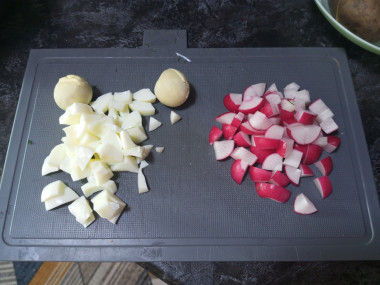 Редис моем и нарезаем кубиками, тоже мелкими. На этот вес (100 г) я брала 4 средних редиса. Вместо обычного редиса можно взять дайкон - это белый подвид редьки. Чем дайкон отличается от редиса? Он не содержит горчичного масла и не имеет резкого запаха.