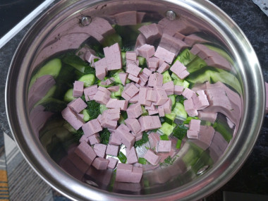 Колбасу берем без сала хорошего качества. Нарезаем кубиками такими же по величине, как и остальные продукты. Чем можно заменить колбасу? Вместо колбасы можно использовать отварную куриную грудку или мясо нежирной говядины.