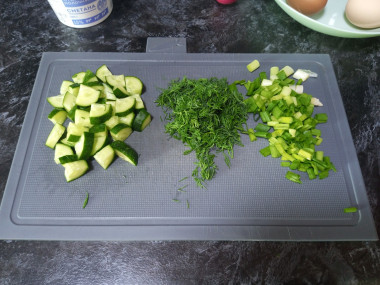 Огурец моем, срезаем кончики и нарезаем мелкими кубиками. Зеленый лук и укроп моем и измельчаем. Я использовала один обычный небольшой огурец, если у вас тепличный, то хватит и половины, так как они обычно длинные.