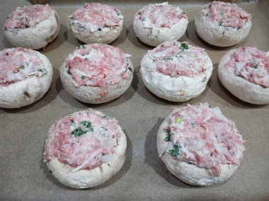 Шляпки шампиньонов плотно нафаршируйте начинкой.