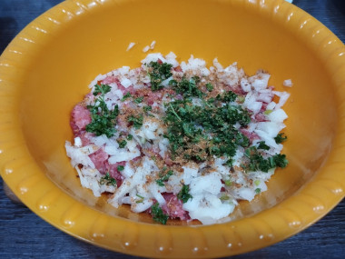 Лук нарежьте мелкими кубиками или измельчите в блендере. Если вы или ваши дети не любите лук, можете вообще его не добавлять. Петрушку или другую зелень по вашему вкусу вымойте, обсушите и мелко порубите.