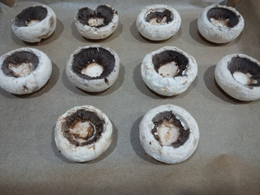 Грибы вымойте, обсушите. Отделите ножки от шляпок. Шляпки слегка посолите внутри. Шампиньоны берите с крупными шляпками, чтобы туда поместилась начинка.