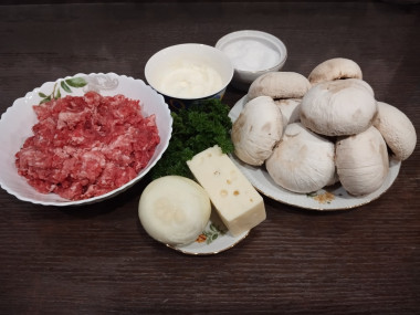 Как сделать грибы шампиньоны, фаршированные в духовке с фаршем и сыром? Подготовьте ингредиенты. Фарш для котлет можете делать из любого мяса и его сочетаний. У меня из свинины и говядины. Можете взять готовый магазинный фарш или сделать самостоятельно, пропустив мясо через мясорубку. Если используете замороженное мясо, необходимо предварительно правильно его разморозить. Подробнее об этом читайте в конце рецепта. Включите духовку на 180 градусов.