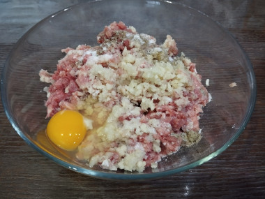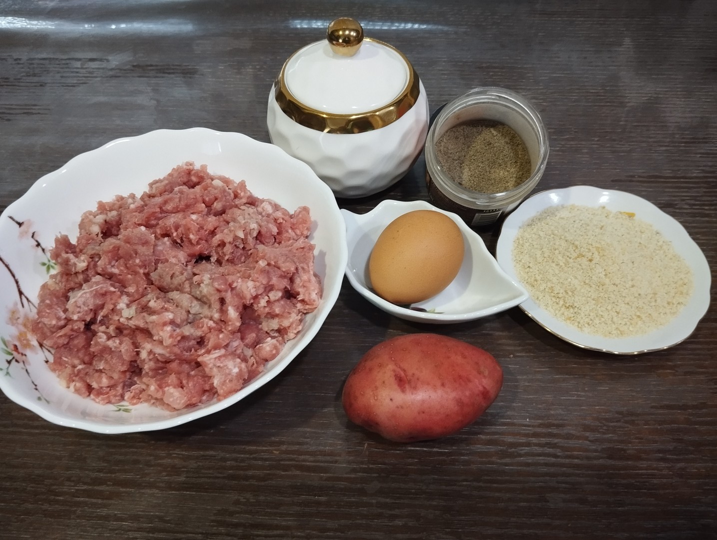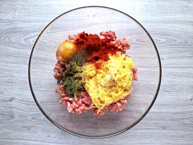 В миске соедините мясной фарш, картофель, яйцо, соль и перец. Все тщательно перемешайте до однородности. Можете добавить другие специи по вкусу. Фарш должен получиться сочный, но при этом не жидкий и не текучий. По желанию можете добавить в фарш 1 ст. л. манной крупы и оставить на 20 минут, чтобы крупа разбухла. Либо добавить 1 ломтик размоченного в молоке хлеба.