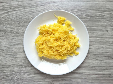 Картофель очистите и натрите на мелкой терке. В этом варианте котлет картофель используется вместо лука для придания сочности. Картофель можете заменить на кабачок.