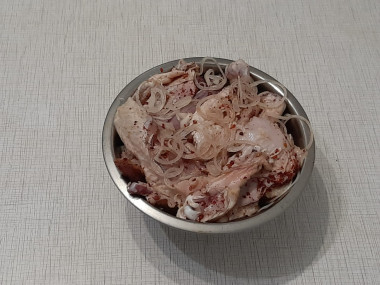 Последним маринад требует репчатый лук кольцами. Переходим к маринованию. Главное не торопиться, ведь на полноценное маринование потребуется целых три часа. В идеале, чем дольше маринуется, тем лучше мясо впитает соки, а это очень хорошо, ведь тогда оно будет очень сочным и невероятно ароматным.