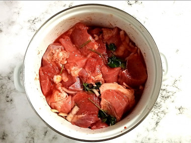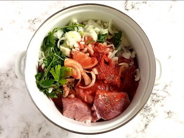 Никогда еще я не мариновала мясо с добавлением томата, было интересно попробовать результат. У меня не было готового томатного сока, поэтому я развела две ложки томатной пасты в воде и посолила готовый раствор. Лук и петрушку решила просто хорошо помять, чтобы выделился сок. В качестве специй у меня паприка, карри, розмарин, смесь перцев и сушеные овощи. Мясо со всеми добавками хорошо помяла, придавила крышкой и оставила мариноваться на сутки в холодильнике.