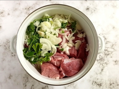 Отправьте свинину в большую, удобную для маринования ёмкость. Посыпьте сверху сухими специями. Я обычно использую готовую смесь для маринования мяса. Поперчите и посолите по вкусу.