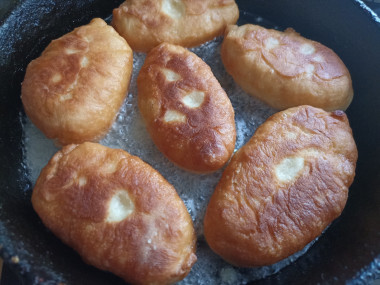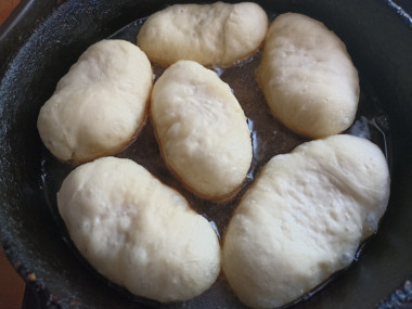 Выкладываем на сковороду с разогретым растительным маслом, оно должно быть разогрето хорошо, но ни в коем случае не гореть. Масло должно доходить до середины пирожка, как показал опыт - масла должно быть довольно много, и пирожки его все-равно возьму столько, сколько нужно
