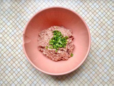 В фарш добавьте зелень, посолите, посыпьте черный молотый перец, хорошо перемешайте.