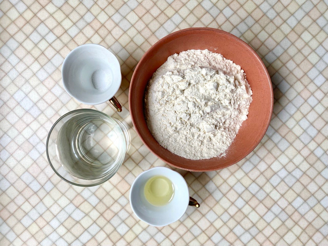 В кипятке растворите соль. Тонкой струйкой влейте кипяток в муку, одновременно замешивая тесто ложкой. Хорошо перемешайте. Затем замесите тесто руками, по необходимости добавьте отложенную муку.