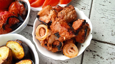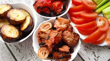 Мы к шашлыку пожарили на шампурах несколько целых помидорок, и, конечно же, картошку, переложив кусочки салом.
