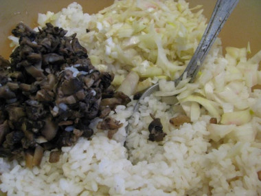 В глубокую ёмкость отправьте рис и обжаренные грибы с луком. Посолите по вкусу, поперчите и добавьте любимые специи.