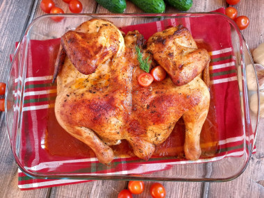 Хороший рецепт! Красивая курочка!! ММ Вкусная видно даже по фото!! А можно сделать ее еще сочнее если нашприцевать рассолом со специями выдержать от 3 часов до 5(можно и на ночь в холодильнике при +4) Далее обмазать(по желанию) смесью специй(или соусом любимым) И готовить в духовке но при t+80+85 часа два или до температуры внутри курочки(у косточки бедра)70-72градуса. А по готовности можно и увеличить температуру в духовке 180 и подрумянить и что бы корочка была. Но это если конечно время позволяет! :=))