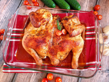Мне приглянулся рецепт курицы в духовке целиком на противне. Захотелось именно такую румяную и ароматную курочку. Мне кажется, в таком развёрнутом виде она даже лучше и быстрее пропекается.