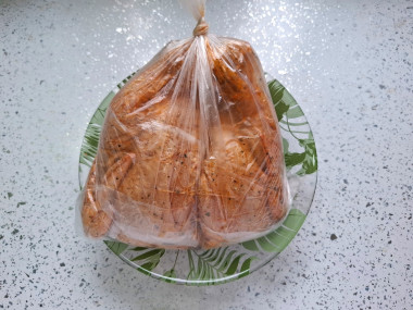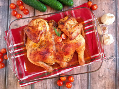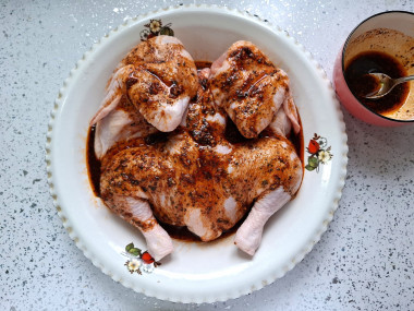 Курицу разрезала по грудке, хорошо промыла и обсушила бумажными полотенцами. Тщательно натерла тушку маринадом со всех сторон и положила в плотный пакет. В течение суток курицу периодически переворачивала на разные стороны. Перед приготовлением достала из холодильника за пол часа. Запекала примерно 1 час при 180°С. Моя курица была весом 1, 2 кг.